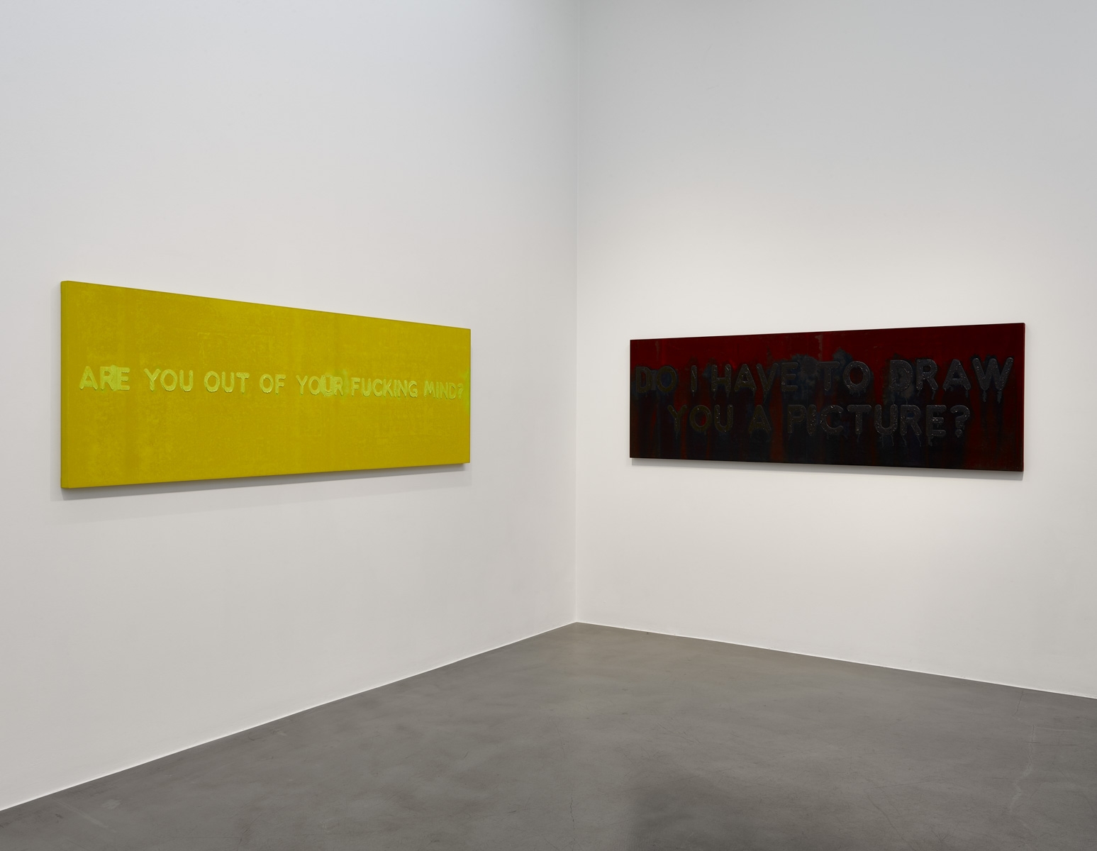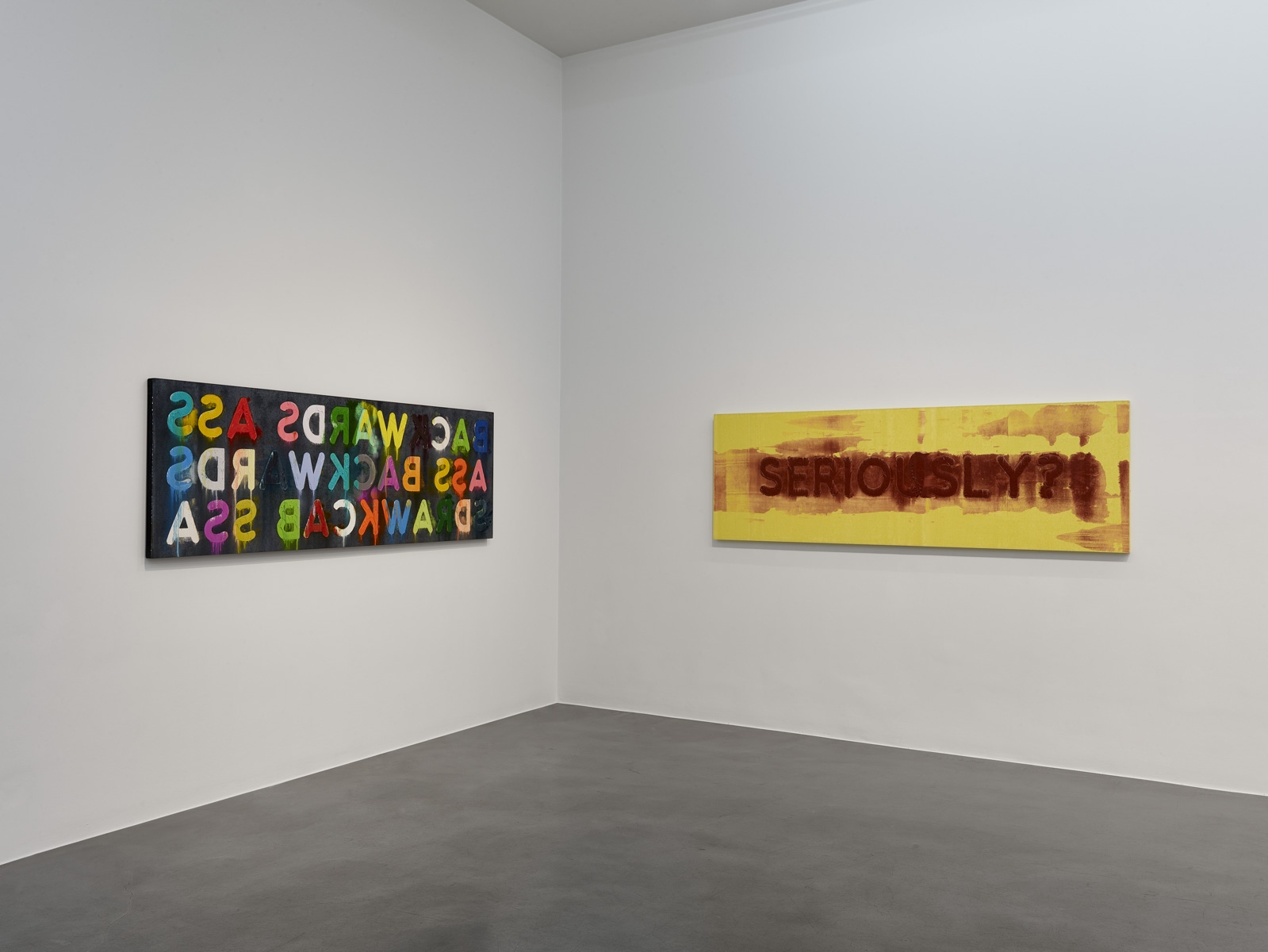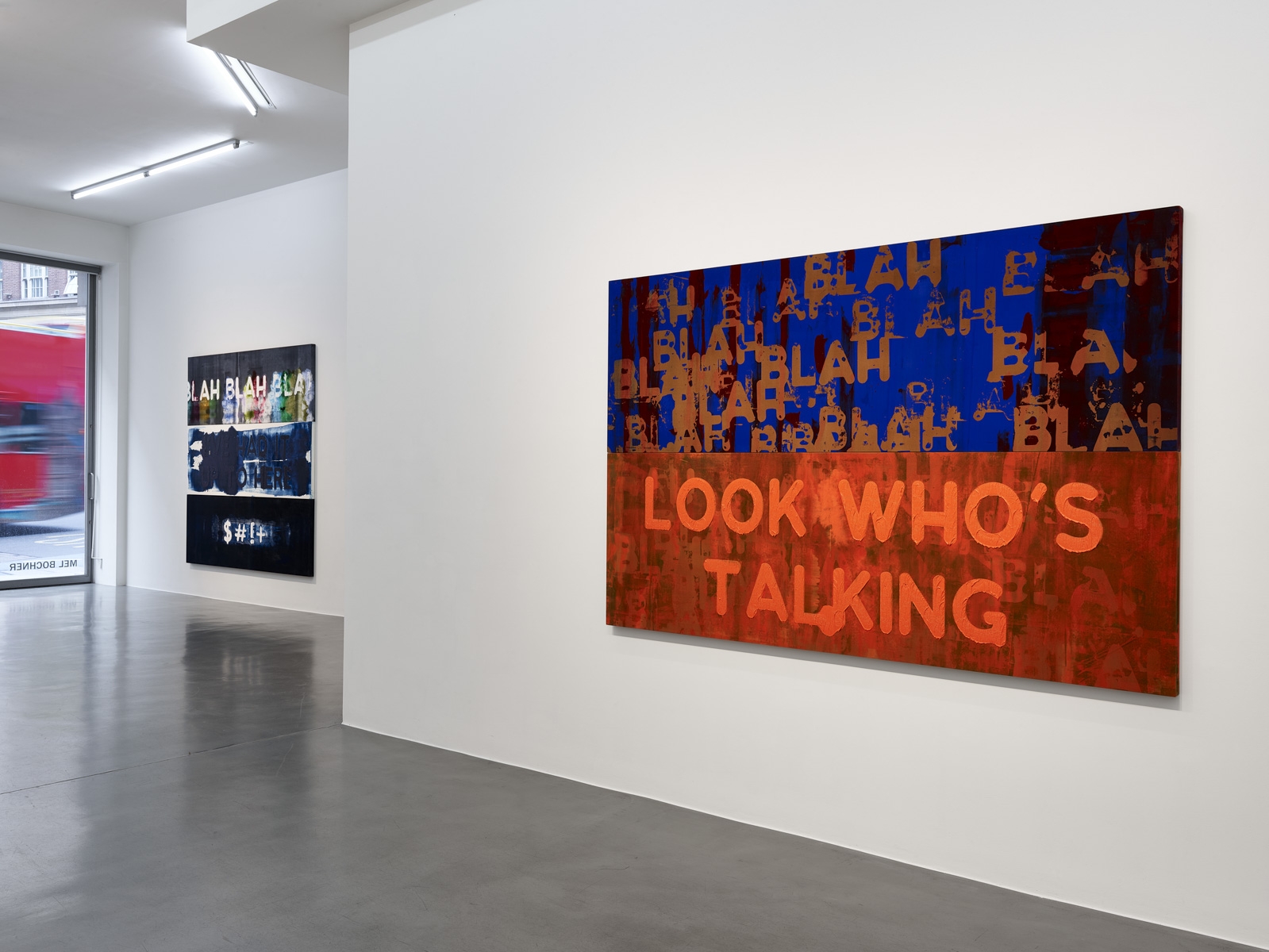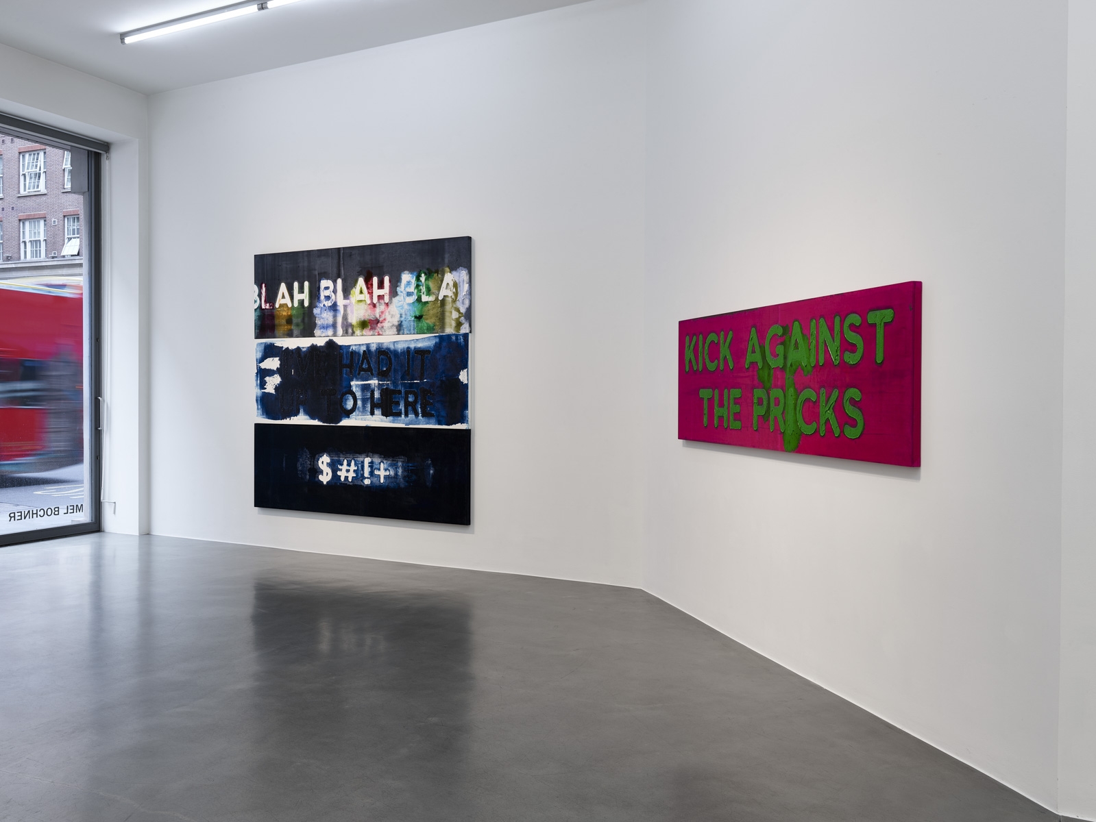 ...This new series of Bochner’s word paintings marks a radical departure for the artist. His inclusion in the 2018 Carnegie International gave rise to a new body of work that combined his signature textual interventions with a largely monochrome palette. Installed throughout the museum in often-unexpected locations the site-specific series accosted visitors with idiomatic, sometimes caustic, expressions from Bochner’s personal phrase dictionary, including ‘Do I have to draw you a picture?’, ‘I’ve had it up to here’ and ‘Are you out of your fucking mind?’ Repetition plays a major role in his work, and he often revisits the same words and phrases. In the 2019 works, Bochner explores the lexicon of the Carnegie International paintings but in a riot of colour, discarding his own strict formal protocol in favour of a liberated approach to form, colour and meaning that more closely resembles his studio painting practice. Each letter oozes with pigment, drips and smudges escaping the crisp edges of the typeface thereby emphasising the material expression of their own execution. Meaning is both enhanced and obscured by Bochner’s technique, which invites the viewer to re-consider the ways in which we interpret language and image.