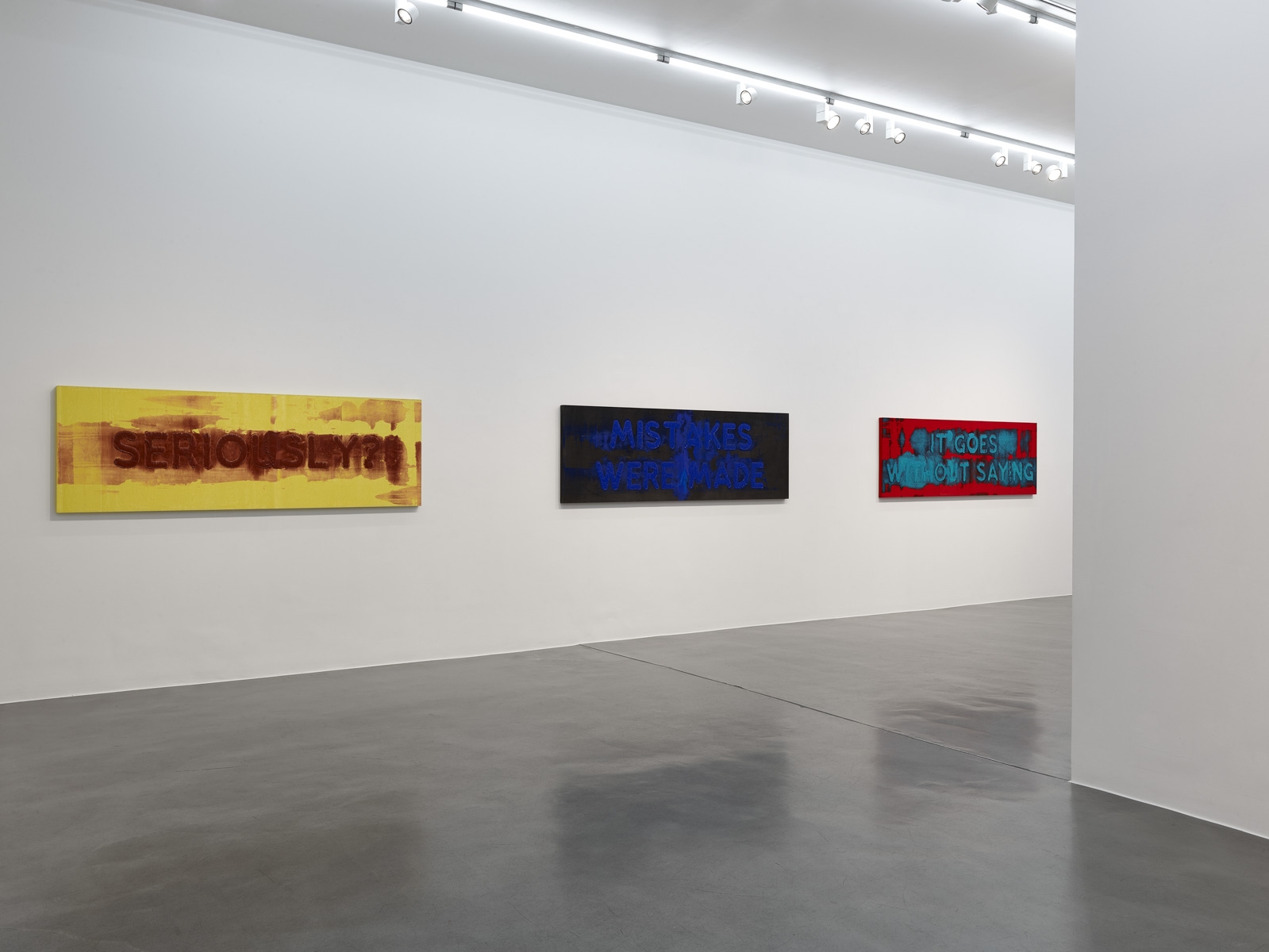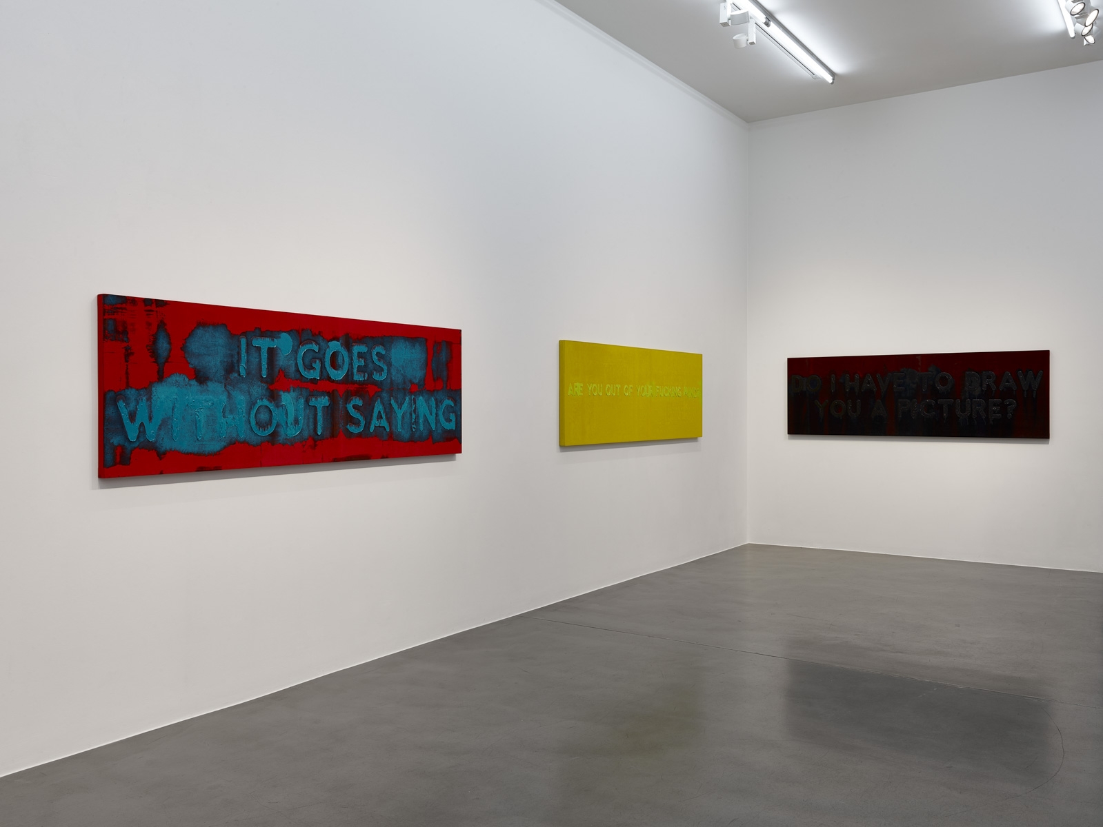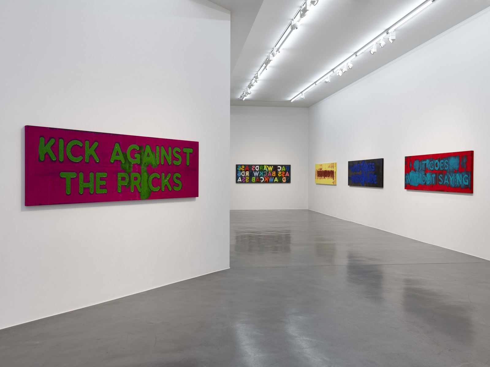 ...This new series of Bochner’s word paintings marks a radical departure for the artist. His inclusion in the 2018 Carnegie International gave rise to a new body of work that combined his signature textual interventions with a largely monochrome palette. Installed throughout the museum in often-unexpected locations the site-specific series accosted visitors with idiomatic, sometimes caustic, expressions from Bochner’s personal phrase dictionary, including ‘Do I have to draw you a picture?’, ‘I’ve had it up to here’ and ‘Are you out of your fucking mind?’ Repetition plays a major role in his work, and he often revisits the same words and phrases. In the 2019 works, Bochner explores the lexicon of the Carnegie International paintings but in a riot of colour, discarding his own strict formal protocol in favour of a liberated approach to form, colour and meaning that more closely resembles his studio painting practice. Each letter oozes with pigment, drips and smudges escaping the crisp edges of the typeface thereby emphasising the material expression of their own execution. Meaning is both enhanced and obscured by Bochner’s technique, which invites the viewer to re-consider the ways in which we interpret language and image.