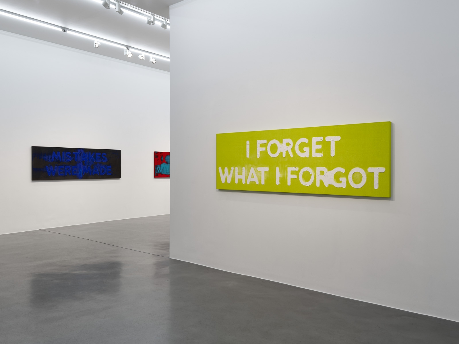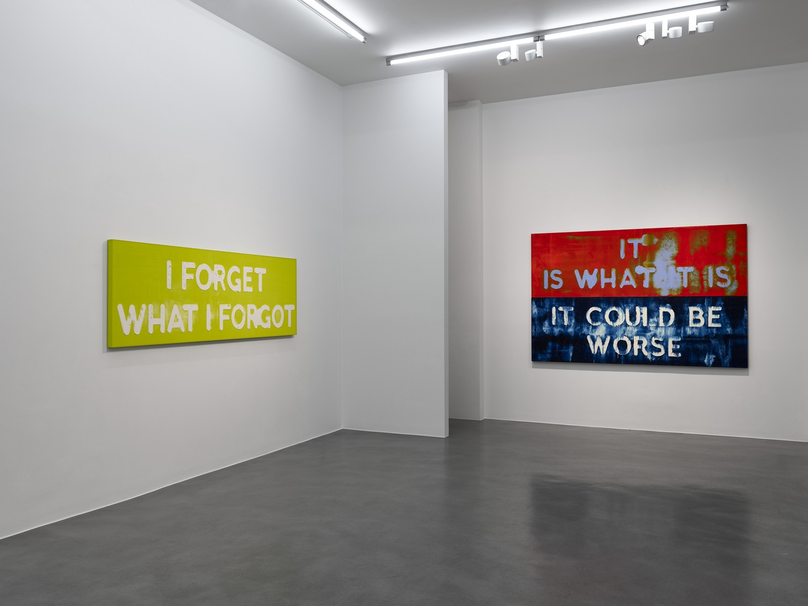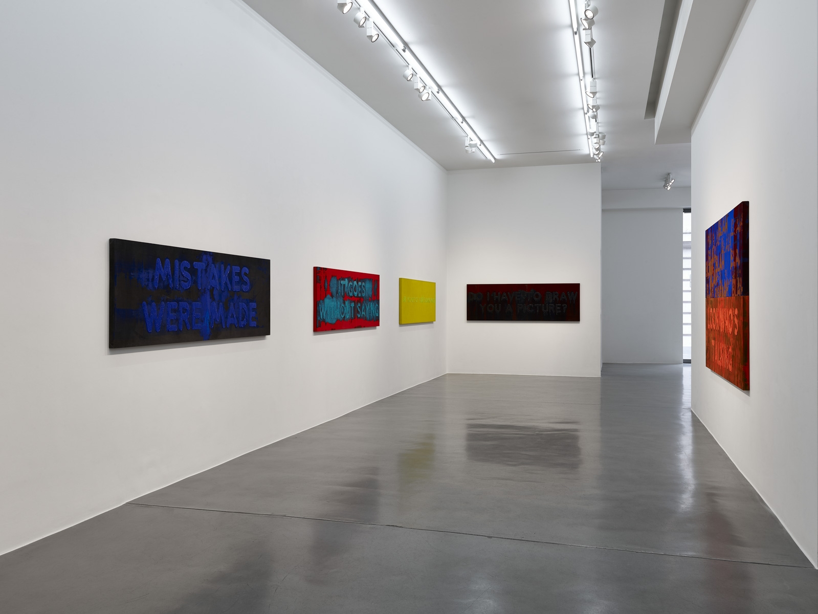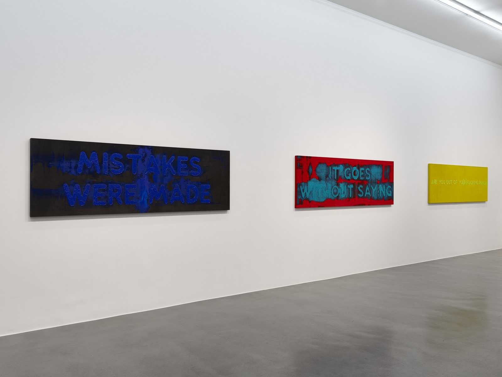 ...This new series of Bochner’s word paintings marks a radical departure for the artist. His inclusion in the 2018 Carnegie International gave rise to a new body of work that combined his signature textual interventions with a largely monochrome palette. Installed throughout the museum in often-unexpected locations the site-specific series accosted visitors with idiomatic, sometimes caustic, expressions from Bochner’s personal phrase dictionary, including ‘Do I have to draw you a picture?’, ‘I’ve had it up to here’ and ‘Are you out of your fucking mind?’ Repetition plays a major role in his work, and he often revisits the same words and phrases. In the 2019 works, Bochner explores the lexicon of the Carnegie International paintings but in a riot of colour, discarding his own strict formal protocol in favour of a liberated approach to form, colour and meaning that more closely resembles his studio painting practice. Each letter oozes with pigment, drips and smudges escaping the crisp edges of the typeface thereby emphasising the material expression of their own execution. Meaning is both enhanced and obscured by Bochner’s technique, which invites the viewer to re-consider the ways in which we interpret language and image.