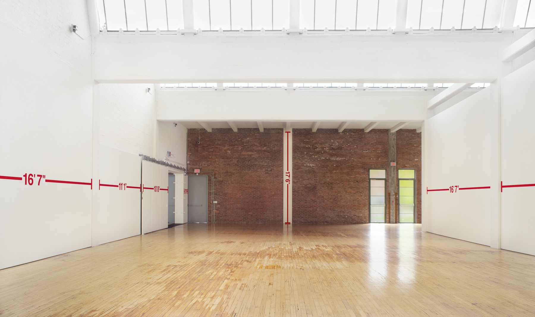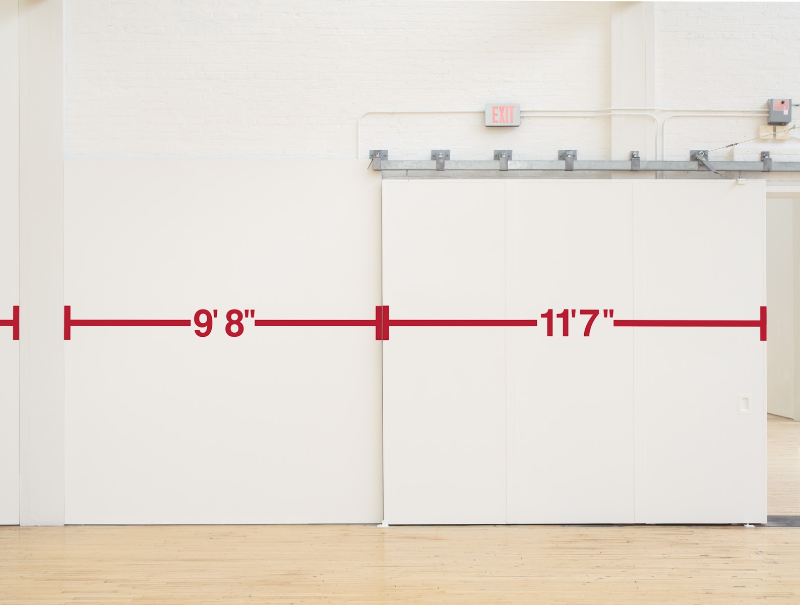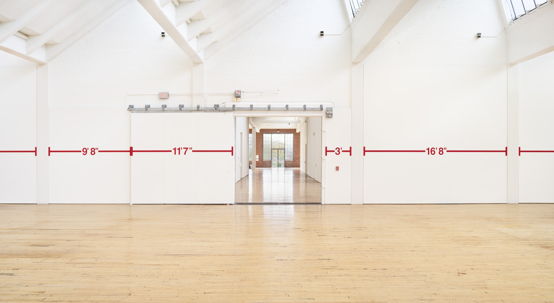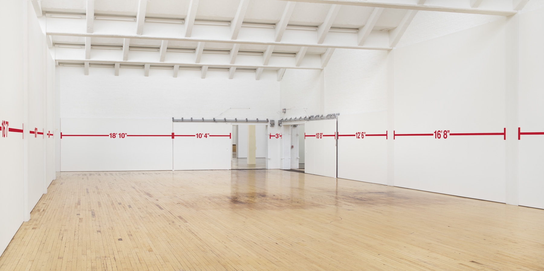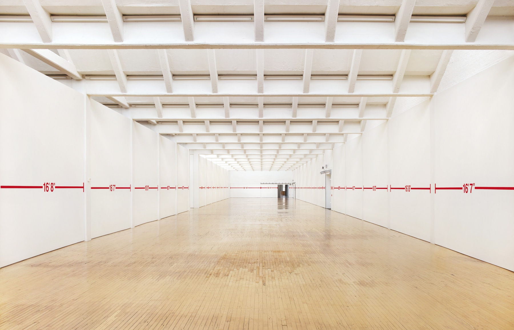 In May 1969 Bochner realized the first works in his ongoing Measurement series, using black tape to draw simple, linear segments across the surfaces of Dia cofounder Heiner Friedrich’s Munich gallery. Punctuating these lines were numbers that corresponded to the length of the measured surface: the width of a window bay, the height of a doorframe, and so on. Several of the measurements were further subdivided, indicated by notched marks interspersed at intervals across a wall. In this work, as in subsequent iterations of this series, Bochner used lines to wrap around the architectural envelope of the gallery in a systematic evaluation of its spatial parameters and the perceptual experience that unfolds within it. At Dia Beacon, red tape maps the various surfaces of one of the museum’s largest galleries, running horizontally across walls at a height corresponding to the artist’s eye level.