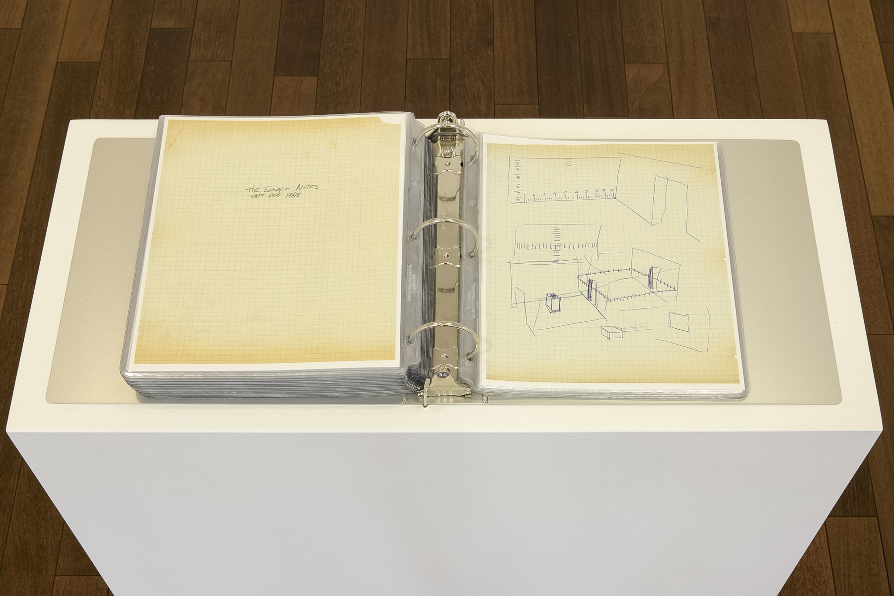 During a discussion with Sébastien Pluot in 2013, the artist spoke about this work. They then decided to record a further conversation as they looked through each page of notes. It is this transcription which is included in the second half of the recent Singer Notes, 1968 publication, while the first half of said publication comprises an exact copy of the Singer Notes themselves.